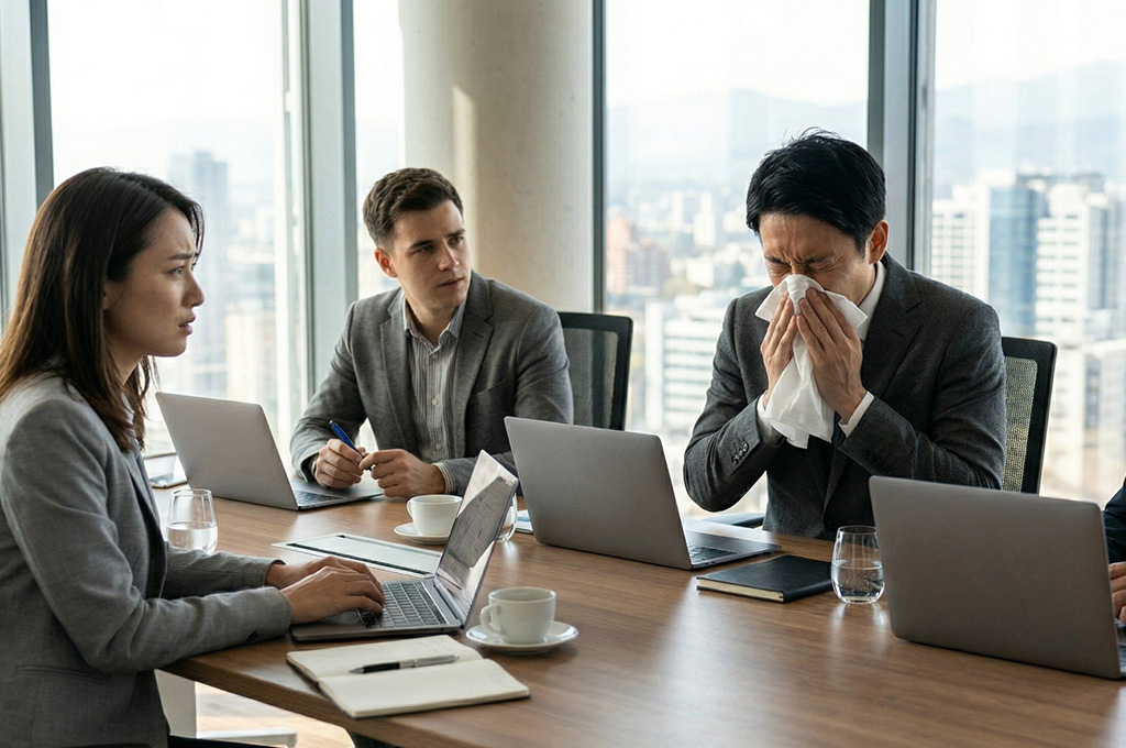 例えば、会議中にくしゃみで会話が中断される、鼻をすする音が気になるといった場面は少なくありません。