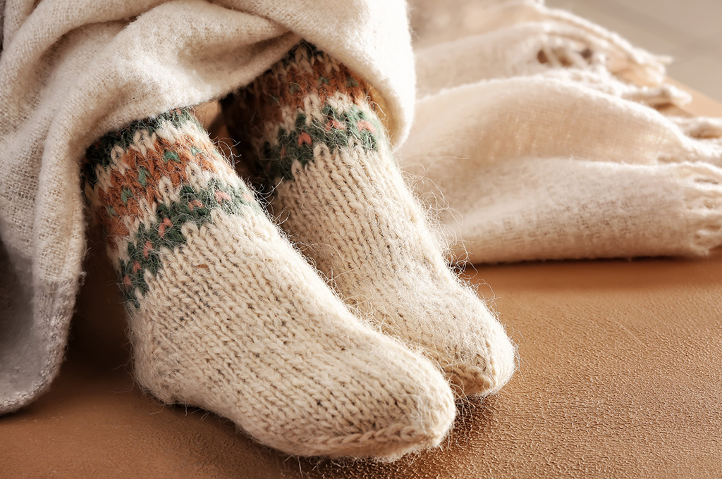 たとえば、重ね着や腹巻き、ネックウォーマー、厚手の靴下を身につけると、体から熱が奪われにくくなります。