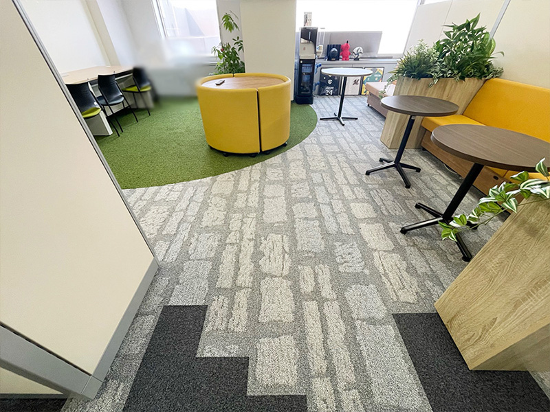 タイルカーペットの色とデザインを変えただけで、空間全体がぐっと明るくなり、リラックスできるフリースペースが誕生しました。